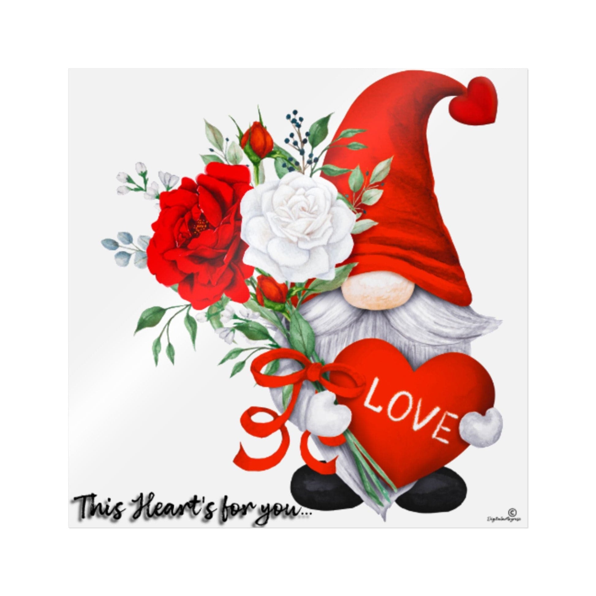 A cheerful die-cut sticker of a Valentine gnome clutching a heart that reads "LOVE," wrapped in red and white roses. The clear, glossy film lets the artwork float on windows, laptops, or smooth glass surfaces while a matte UV laminate keeps colors bright against sun, splash, or scratches. Small bundles let you share a little joy—stick one on a mailbox, a phone case, or a cozy shop window to announce warmth and whimsy. The compact sizes and strong permanent adhesive make it stay put on smooth, non-porous surfaces so the gnome’s rosy smile can brighten everyday moments and seasonal displays alike.